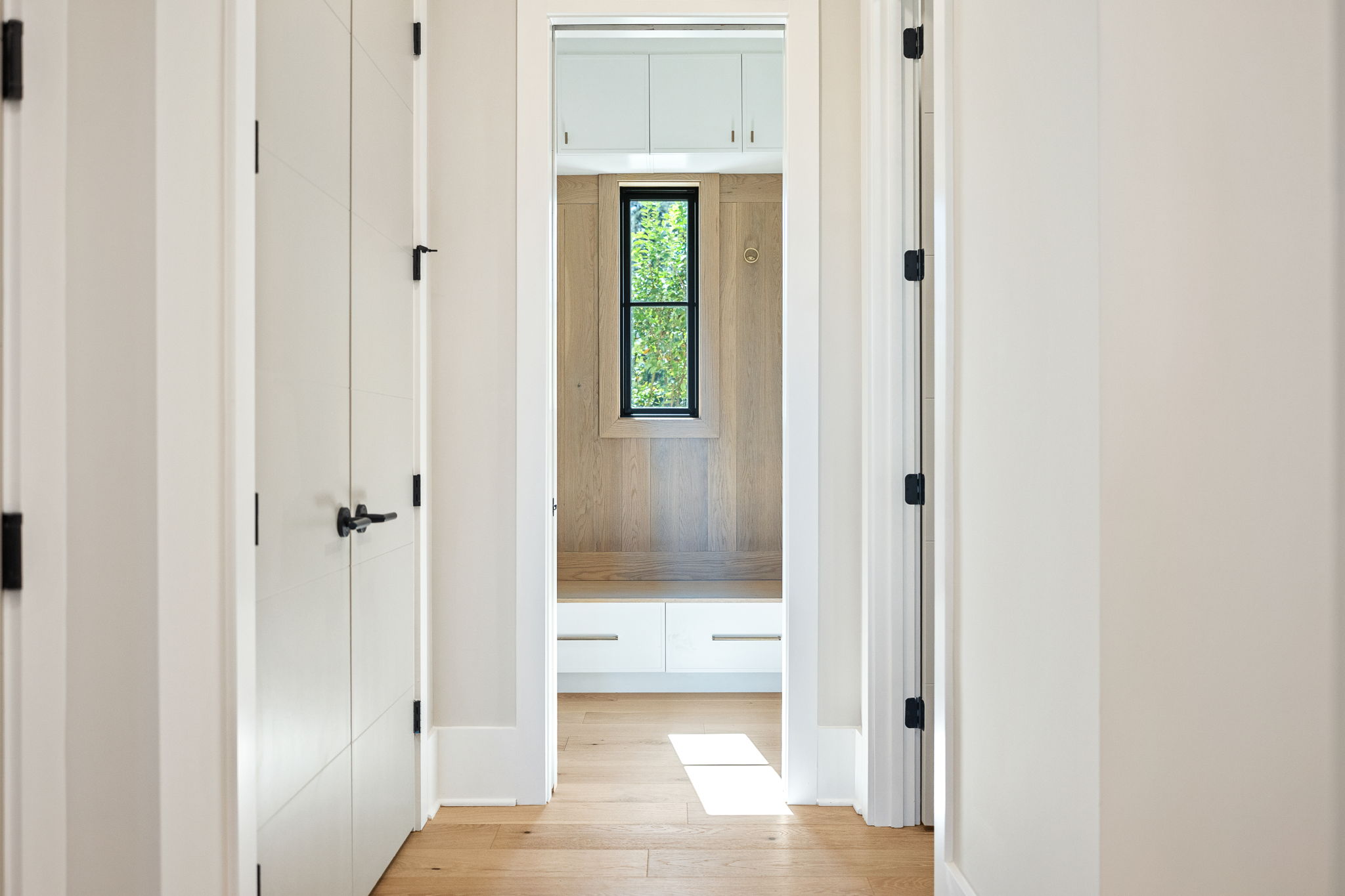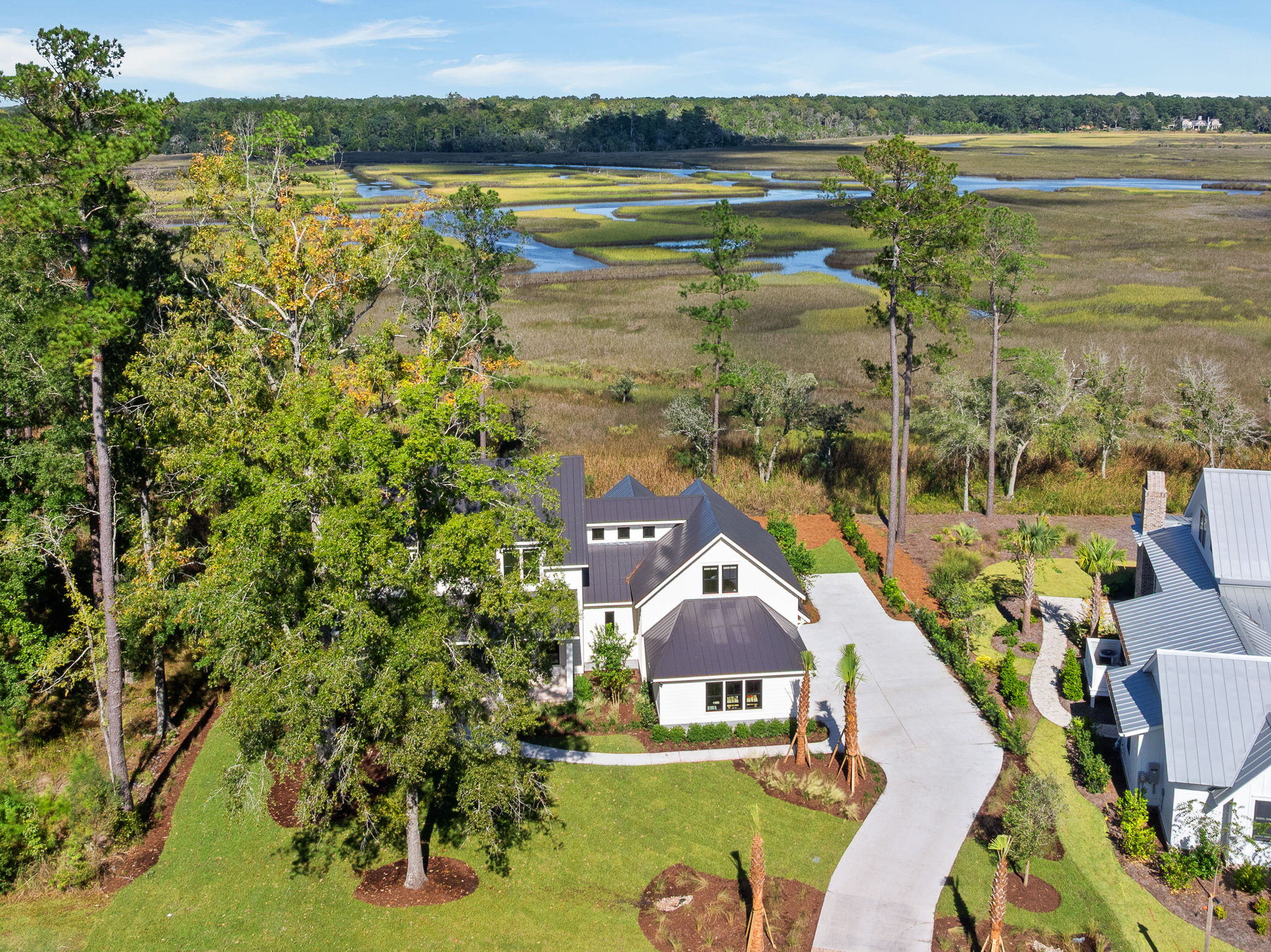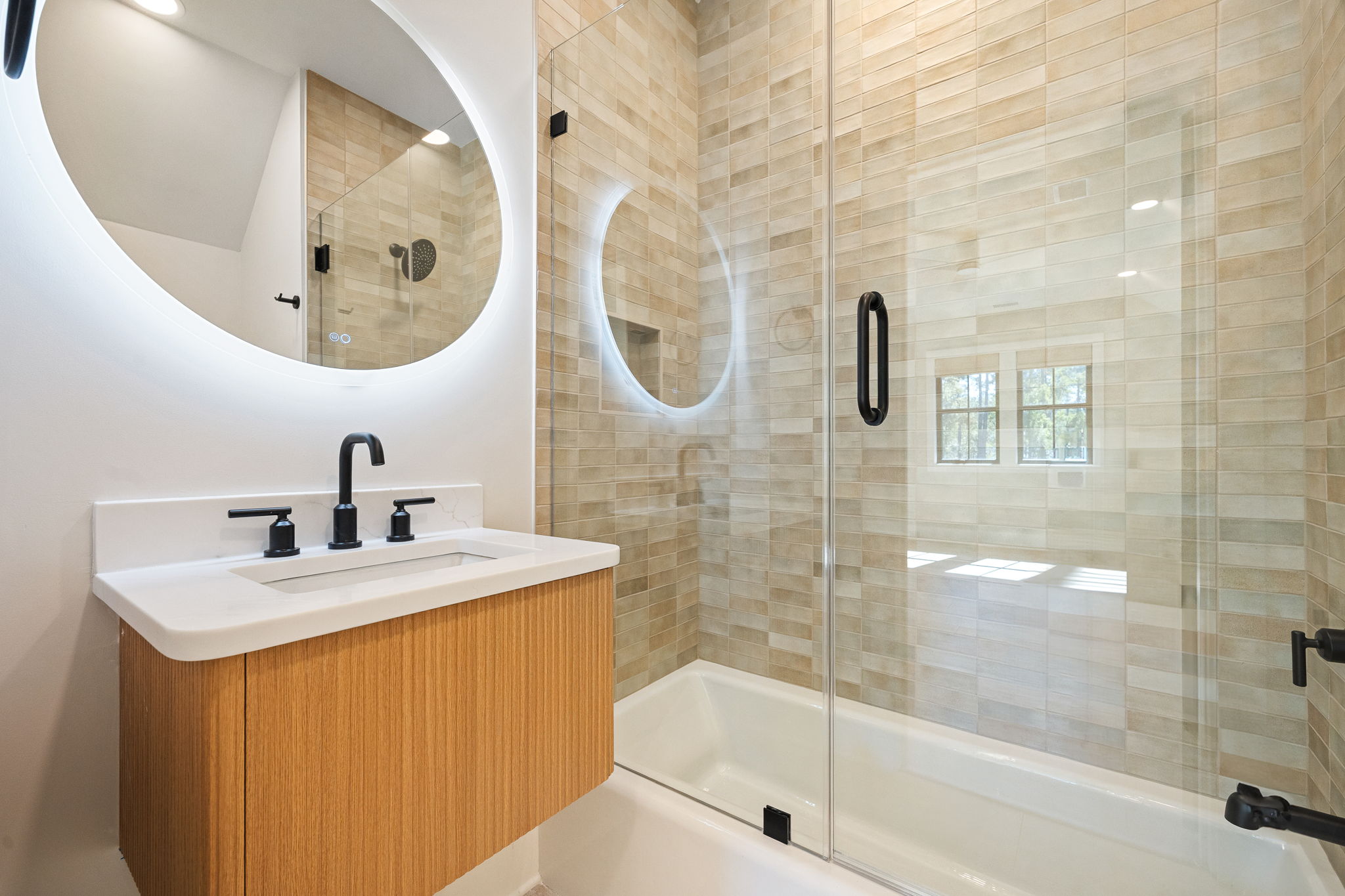 The exterior draws on classic Lowcountry form with a modern edge; crisp white siding, standing seam metal roofing, and black-framed windows give the home a timeless but contemporary curb appeal. Inside, that modern warmth carries through in every room. A custom slatted wood fireplace wall becomes a sculptural centerpiece in the living area, echoed by matching barn doors and stair details. Wide-plank oak floors, black steel railings, and clean-lined millwork provide a calm, consistent backdrop throughout. In the primary bathroom, soft natural tones meet playful modern touches, like the organically shaped mirror, gold fixtures, and a freestanding tub set into a spa-like wet room. This space, like every corner of the home, reflects a collaborative design process that prioritized form, function, and personal expression; proving how deeply customized a home can be when vision and craftsmanship align.