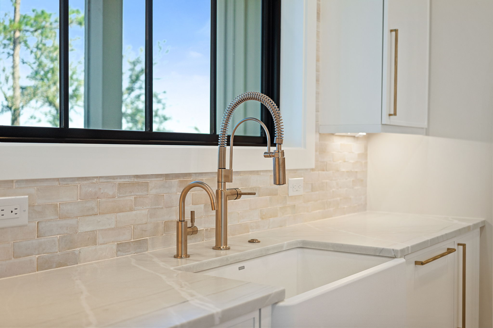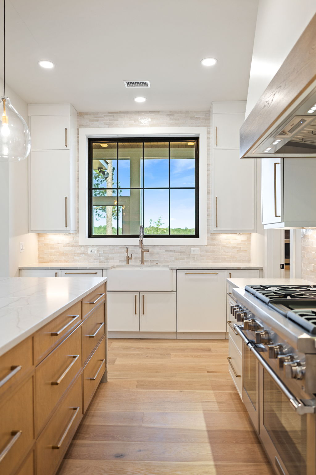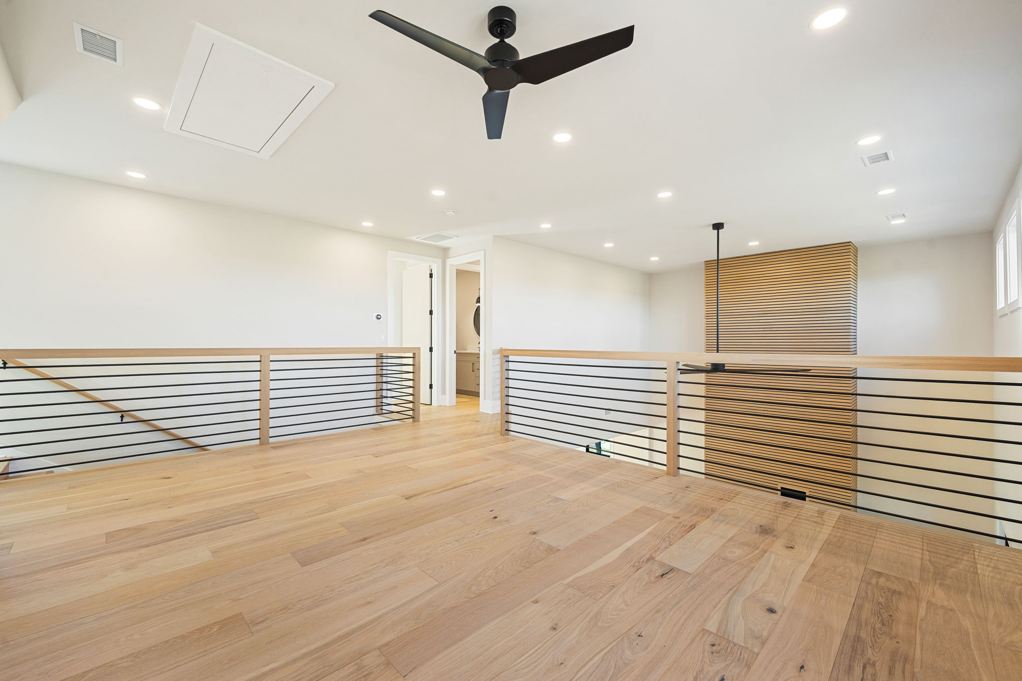 The exterior draws on classic Lowcountry form with a modern edge; crisp white siding, standing seam metal roofing, and black-framed windows give the home a timeless but contemporary curb appeal. Inside, that modern warmth carries through in every room. A custom slatted wood fireplace wall becomes a sculptural centerpiece in the living area, echoed by matching barn doors and stair details. Wide-plank oak floors, black steel railings, and clean-lined millwork provide a calm, consistent backdrop throughout. In the primary bathroom, soft natural tones meet playful modern touches, like the organically shaped mirror, gold fixtures, and a freestanding tub set into a spa-like wet room. This space, like every corner of the home, reflects a collaborative design process that prioritized form, function, and personal expression; proving how deeply customized a home can be when vision and craftsmanship align.
